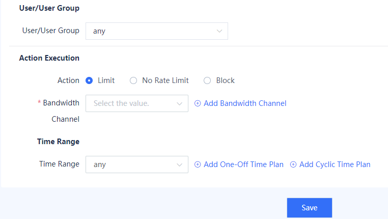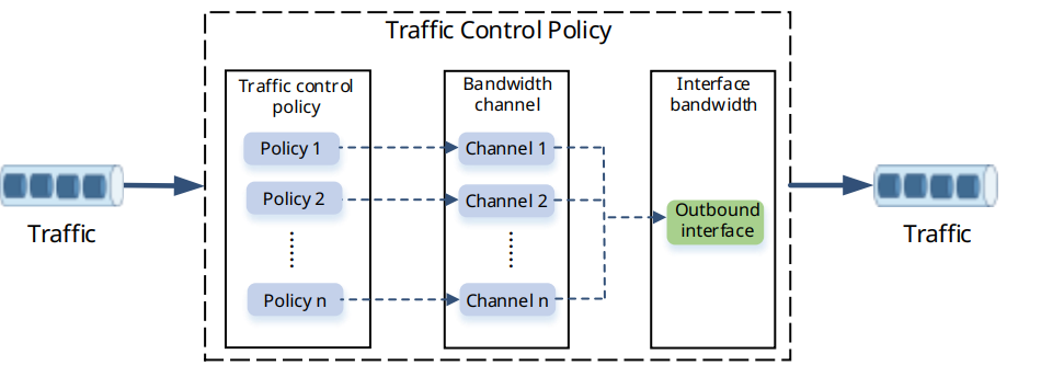 - Trafik kontrol politikası: trafik için eşleştirme koşullarını ve işleme eylemlerini tanımlar ve bant genişliği kanallarına atıfta bulunur.