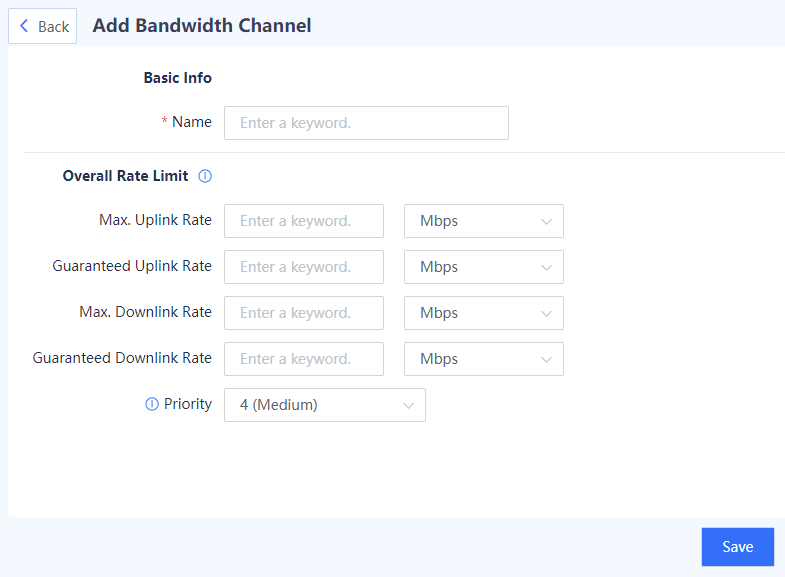 Aşağıdaki şekilde gösterildiği gibi, ruijie firewall trafik kontrolünü trafik kontrol politikaları, bant genişliği kanalları ve hat bant genişliği (arayüz bant genişliği) aracılığıyla uygular.