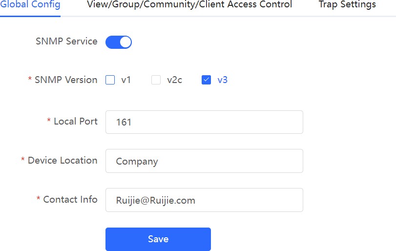 Kullanıcı adı: v3_user Grup adı: group Güvenlik seviyesi: kimlik doğrulama ve şifreleme Kimlik doğrulama protokolü/parolası: MD5/Ruijie123 Şifreleme protokolü/parolası: AES/Ruijie123 |